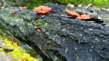 沿途的小桥皆为原木搭就,雨水的滋润下,长满了类似木耳的菌类,一丛丛,一簇簇,小蚂蚁在其中快速的穿梭,每一座小桥,俨然便是一个小小的生态园!
