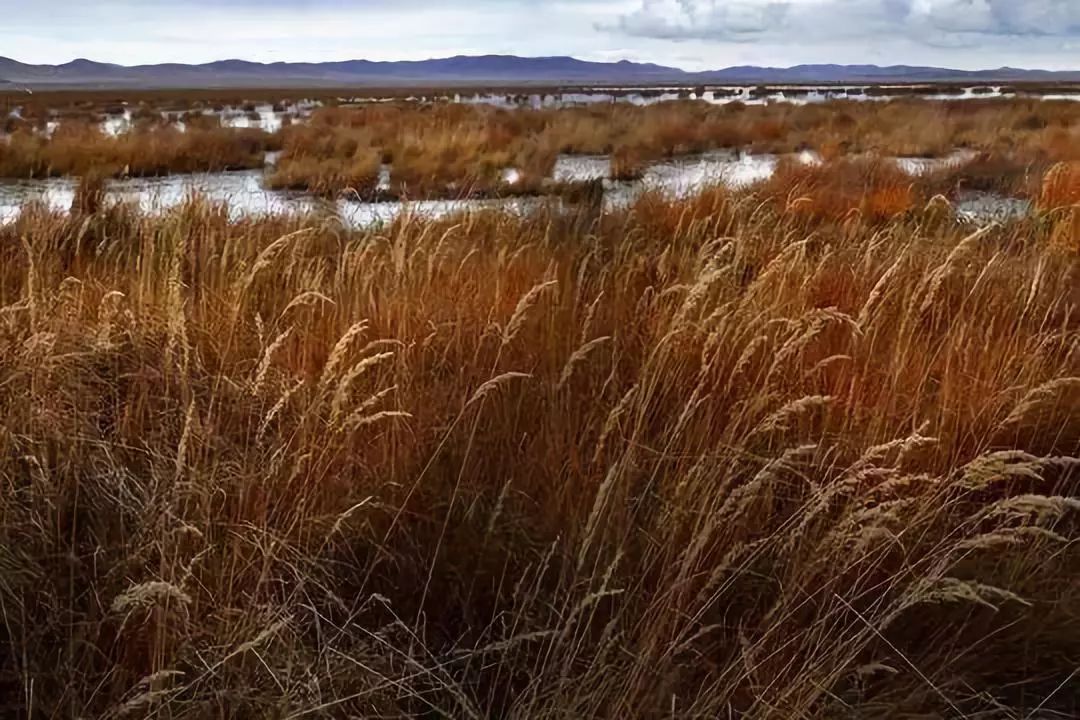昔日碧绿的湿地草原和岸边丰茂的芦苇,在阳光下变得一片金黄。