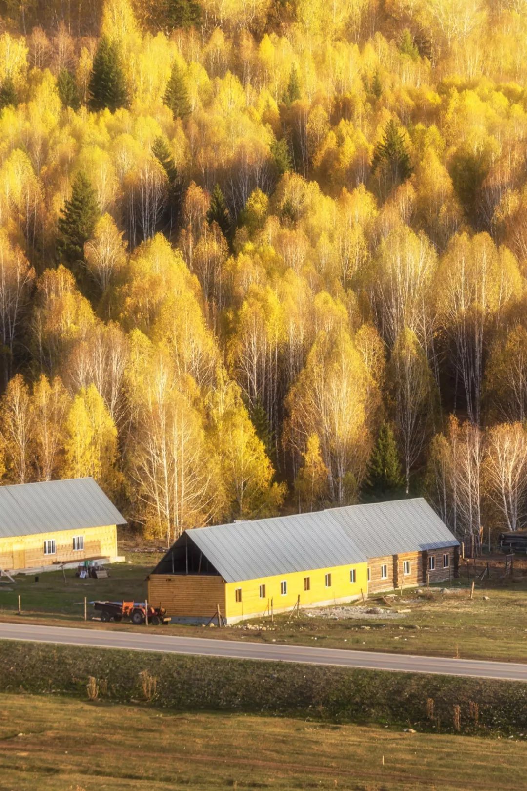 古朴的村子被五彩斑斓的秋林包裹着,农人赶着牛从树下路过,仿佛路过了一整个秋天。