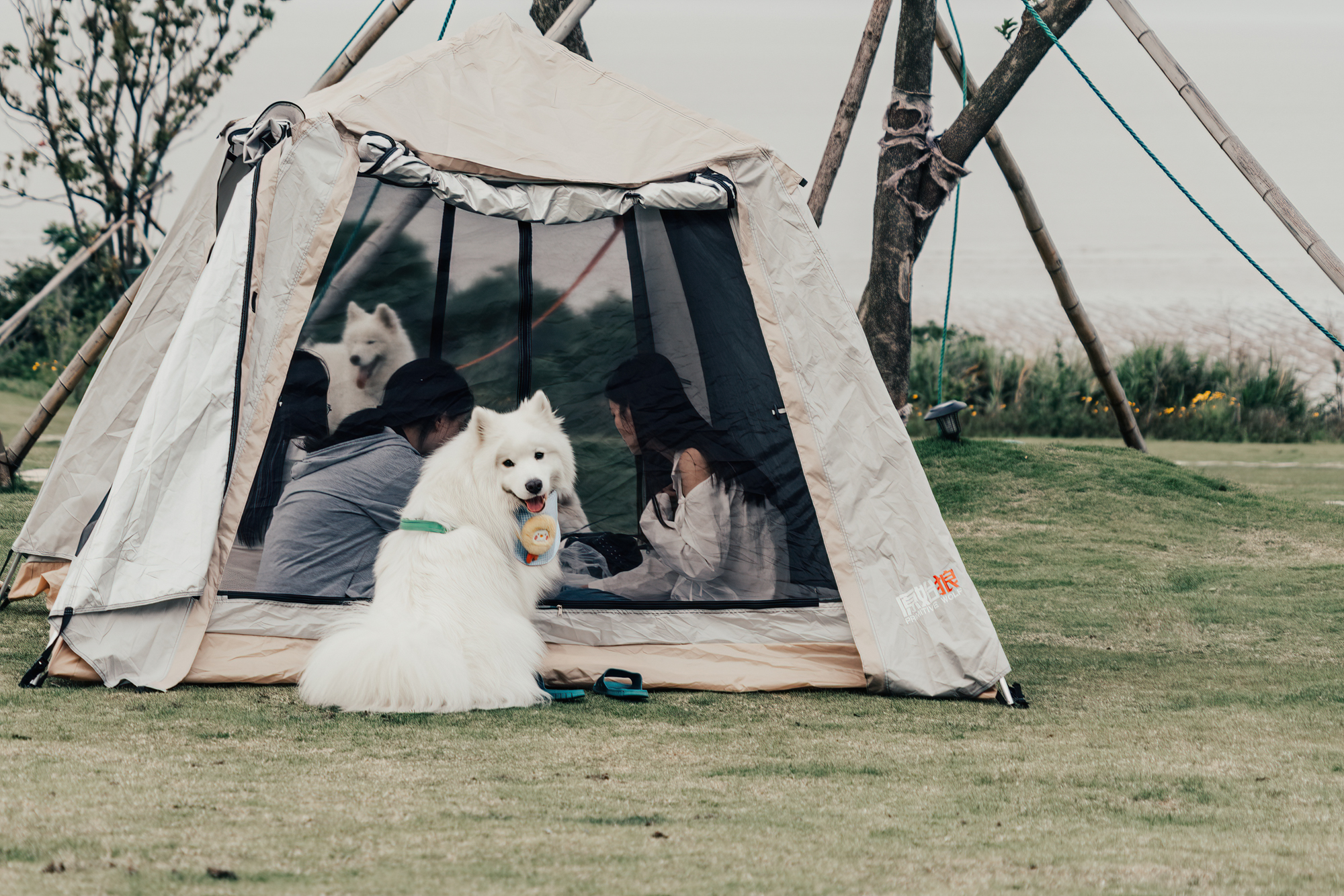 牵着萌宠露营,小狗可爱的模样令人怜爱。
