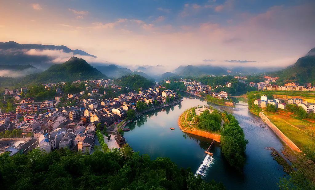 与蜿蜒的江水一同形成秀丽的风光