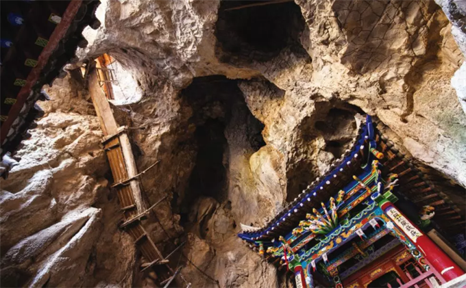 最牛的是,要想登上这些殿宇,你必须手脚并用。因为不是石阶、铁链,就是索梯、栈道,还没有护栏保护的那种。其惊险程度,简直和华山享誉国内外的悬空栈道一样。看到这里,大家是不是也必须由衷感叹一句:"小华山"的名号果然名不虚传!