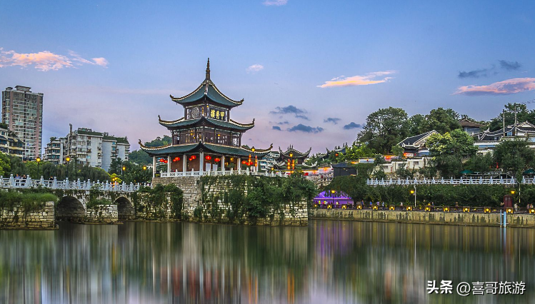 【贵阳文昌阁】位于贵州省贵阳市云岩区文昌北路1号。据《贵州通志》记载,阁始建于明万历二十四年(1596年),占地1200平方米,以设计巧妙、结构独特而著名。文昌阁是中国一种传统祭祀建筑,许多地方都有修建,但各地文昌阁内所祀神祇数目不一。一般来说,文昌阁都是四角形、六角形、八角形,但贵阳文昌阁却是九角形楼阁,建筑风格奇特:文昌阁底层呈正方形,第二层和第三层是不等度数9个角;文昌阁共有81根梁、54根柱,都是9的倍数;二、三层的椤木,各为9根。“九”在易经里意味着至高无上,代表崇高的地位。文昌阁坐落在贵阳城老东门的月城上,地势较高,登阁远眺,山川城郭尽收眼底,视野辽阔,是欣赏贵阳风景的好去处。