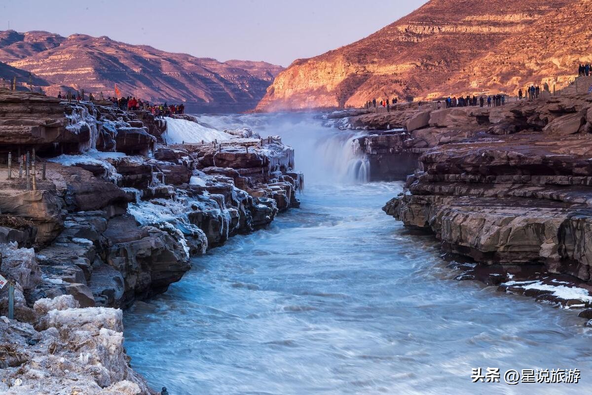 壶口瀑布东濒山西省临汾市吉县壶口镇,西临陕西省延安市宜川县壶口镇,为两省共有旅游景区。壶口瀑布是中国第二大瀑布,世界上最大的黄色瀑布 。黄河奔流至此,两岸石壁峭立,河口收束狭如壶口,故名壶口瀑布。瀑布上游黄河水面宽300米,在不到500米长距离内,被压缩到20—30米的宽度。1000立方米/秒的河水,从20多米高的陡崖上倾注而泻,形成“千里黄河一壶收”的气概。