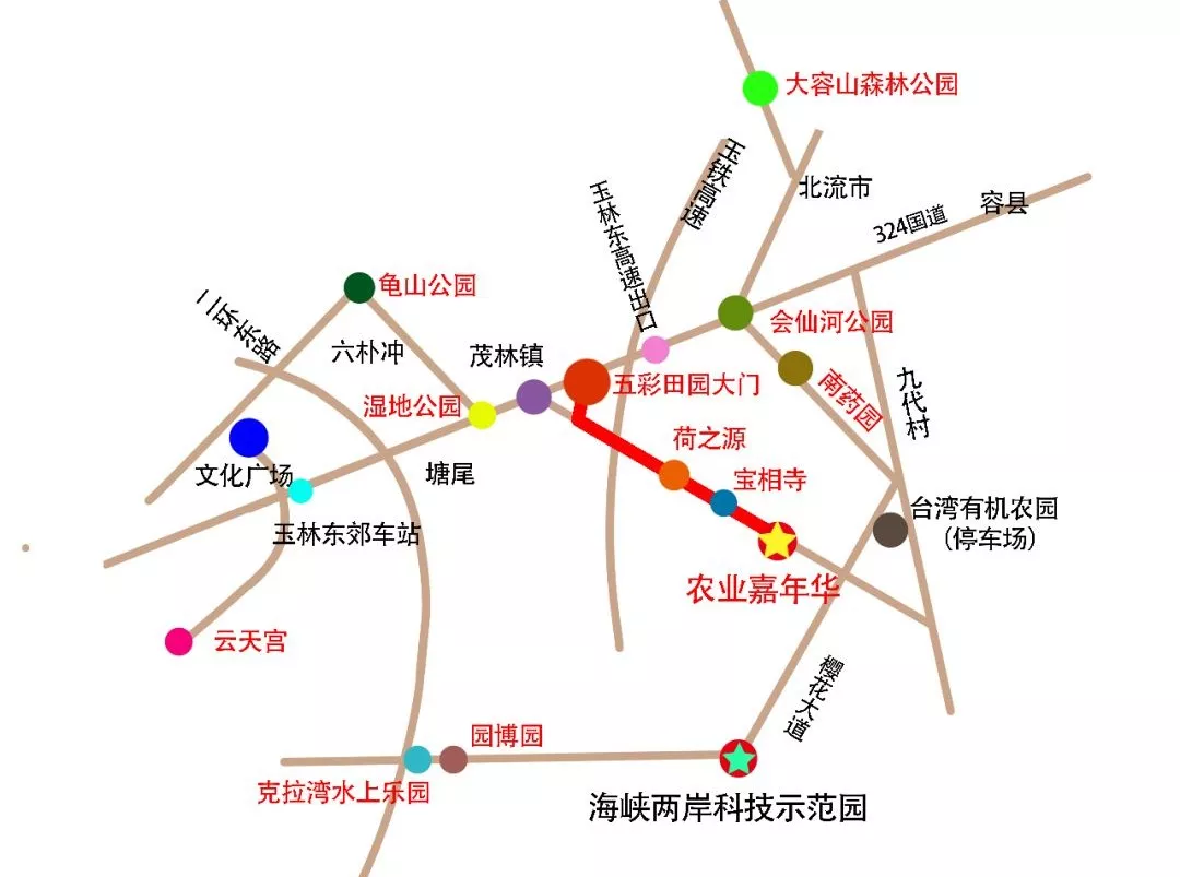 自驾导航:海峡两岸(广西玉林)农业合作科技示范园、五彩田园隆平高科