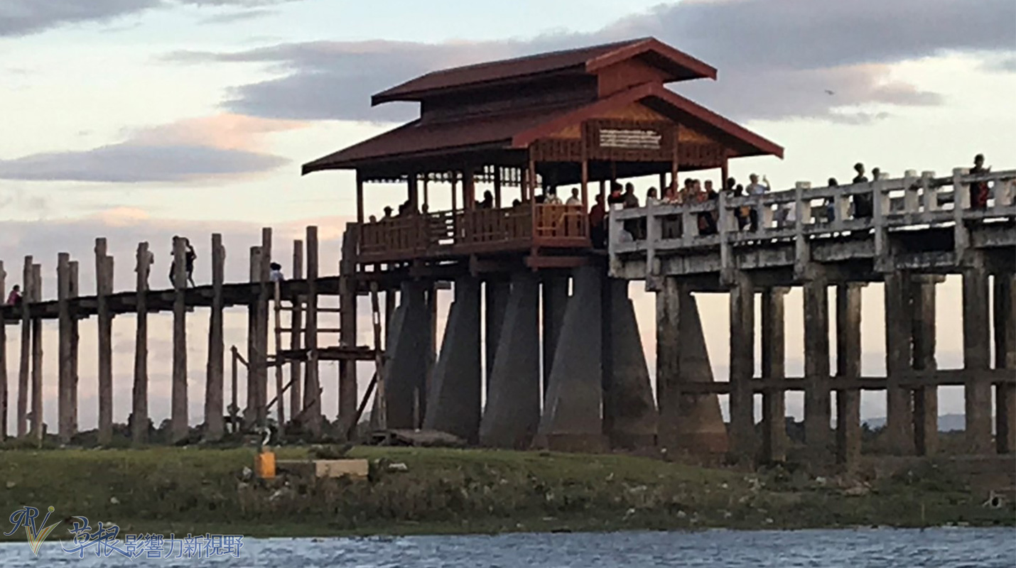 来到湖边,因此时天色已开始变暗,找到一位和善的船夫,谈定好价格包了一条船,从湖面上来欣赏乌本桥,也可见到其它船上的游客满满的笑容,只是担心船上挤满八个人会不会翻船,不过,看到游客满脸的笑容,基本上是相当满意的。船夫相当尽心,总是划划停停让游客能好好拍照。船夫除在桥的一侧让游客欣赏落日、桥身、游客、游船外,也会穿过桥柱到桥的另一侧,可见到渔夫在此打鱼、群鹤驻足及农夫耕作。因当天有部分乌云,故落日余晖被云所遮住,而无法尽显乌本桥的绮丽风光。若问我“乌本桥落日”是否值得世界十大落日美景的赞誉?我的看法是不论是日落或日出,会让您觉得很美的机会并不多,一来常会出现乌云遮蔽,二来陆地有许多障碍物,三来在世界已看过许多日出日落,通常不会有太多惊奇,还不如在台湾的西海岸看日落或台湾东海岸看日出来得更惊喜。出国旅游一切随缘,能来乌本桥感受到落日及细长的桥梁是很棒的旅游体验。