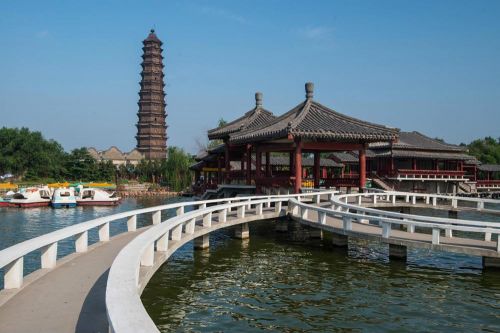 铁塔公园是以现存的铁塔(开宝寺塔)而命名的名胜古迹公园,铁塔建于公元1049年,塔高55.88米,八角十三层,因此地曾有开宝寺,又称“开宝寺塔”,又因遍体通彻褐色琉璃砖,混似铁铸,又称铁塔。素有“天下第一塔”的美称。