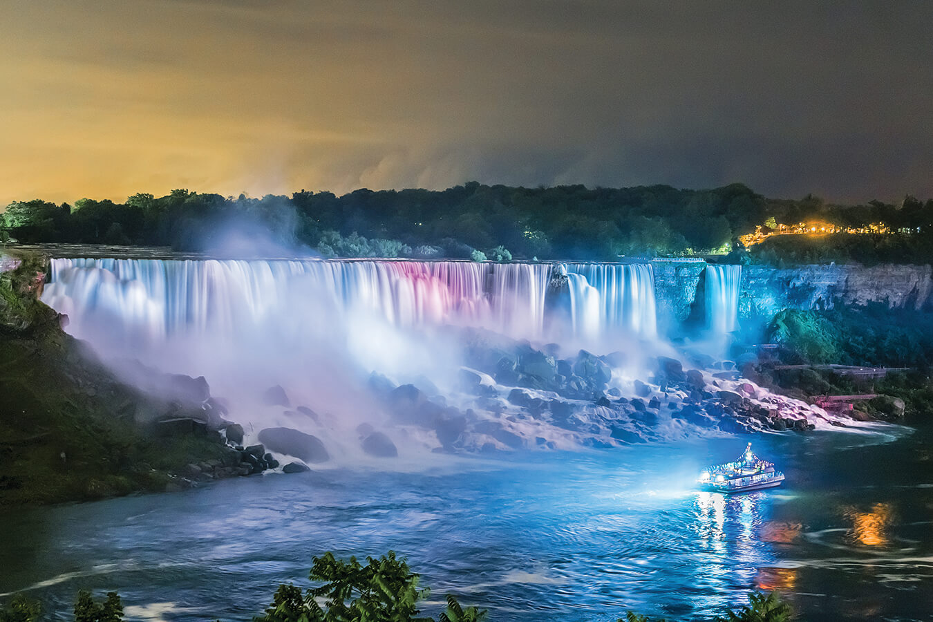是由三座位于北美洲五大湖区尼亚加拉河上瀑布的总称,平均流量为2,407立方米/秒,与伊瓜苏瀑布、维多利亚瀑布并称为世界三大跨国瀑布。尼亚加拉瀑布以美丽的景色,巨大的水力发电能力和极具挑战性的环境保护工程而闻名于世,是非常受游客欢迎的旅游景点[1]。 整个瀑布跨越加拿大的安大略省和美国的纽约州构成南部的尼亚加拉峡谷。三座瀑布按规模从大到小分别为马蹄瀑布,美国瀑布,布里达尔维尔瀑布。其中,马蹄瀑布位于美国和加拿大的边境,美国瀑布全部位于美国境内并由山羊岛分隔开。