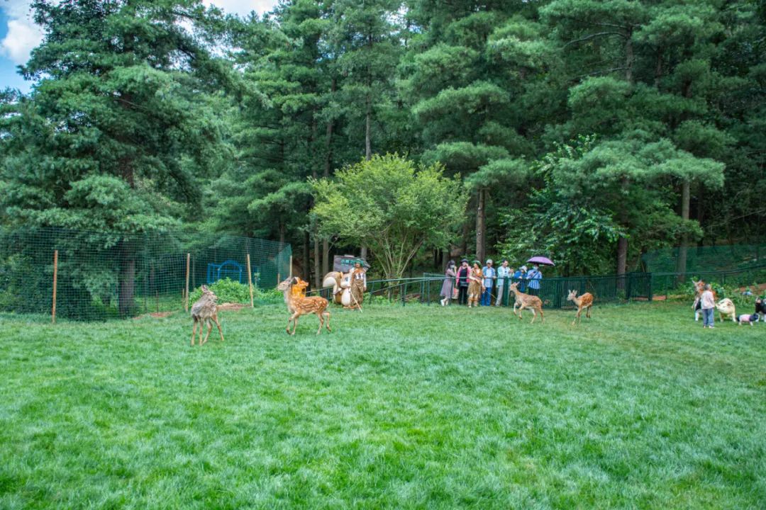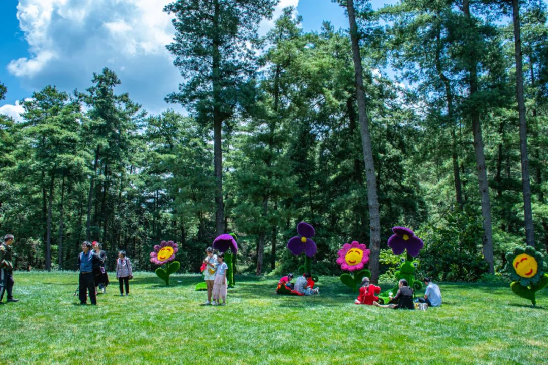 草场可以烧烤、露营、玩耍、逗小矮马和羊驼、梅花鹿与喜洋洋、小黄人、金刚一起玩耍。