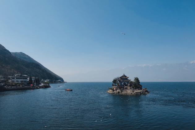 一块三面临水的长形沙洲,洱海边一个小型的生态公园。