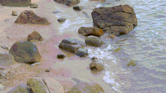 在沙滩上坐下,看看眼前的粉色大海,海浪阵阵拍打着沙滩,感觉空气都凝固在此刻。