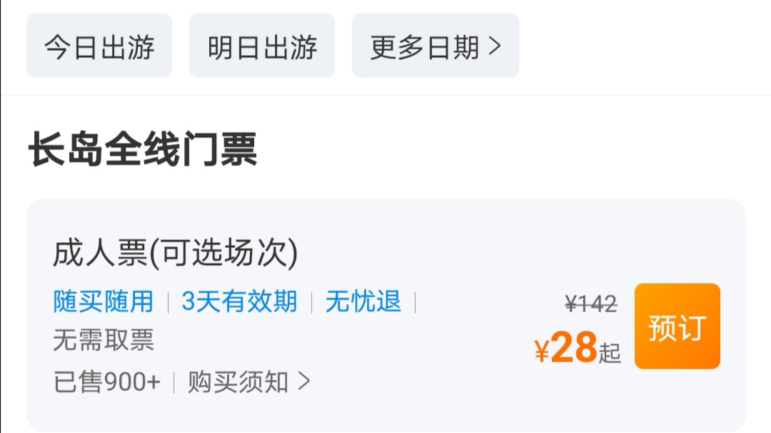- 长岛南北线的景点不单独售票,游客需购买全线票才能游玩。一张全线票包含九丈崖、月牙湾、仙境源、烽山林海这几个景点,网上就可购买。工作日票价28元,周末及节假日71元,有效期3天。票价真的是很良心,而且可以随时申请退款,假如有事没去成,过后系统会自动取消订单并退款,这一点非常人性化。但需要注意的是,假如你只去了其中一两个景点,有的景点没去,系统是不会退款的。