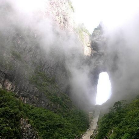 张家界5A级景区天门山有罕见的世界奇观天门洞,是张家界海拔最高山,以其山势高绝如梁山嵩岳而得名,其独特的喀斯特台型地貌举世罕见,为四周绝壁的台形孤山,几公里之内高差达到 1300多米,孤峰高耸、临空独尊,山顶部分相对平坦,宛若绝美的空中花园,也是国家森林公园。天门山旅游区有着“中国最值得外国人去的50个地方、中国最令人向往的地方、中国自驾游百强景区、中国网民最关注的十大景区”等殊荣。登天门山不需爬山,世界最长高山客运索道—天门山索道直达山顶。