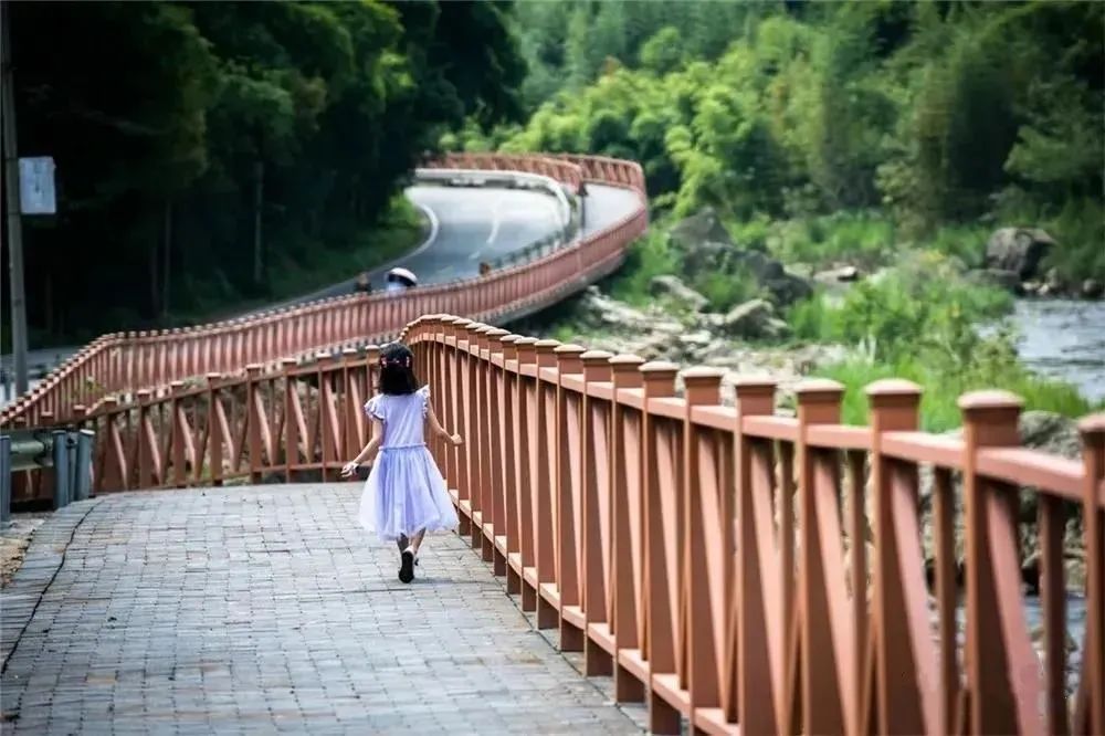 晃悠悠的廊桥就横跨在山间,两岸是葱翠的绿意,脚下是潺潺的溪水,走在上面可以远眺四周的风景,大口呼吸鲜氧,畅快淋漓!