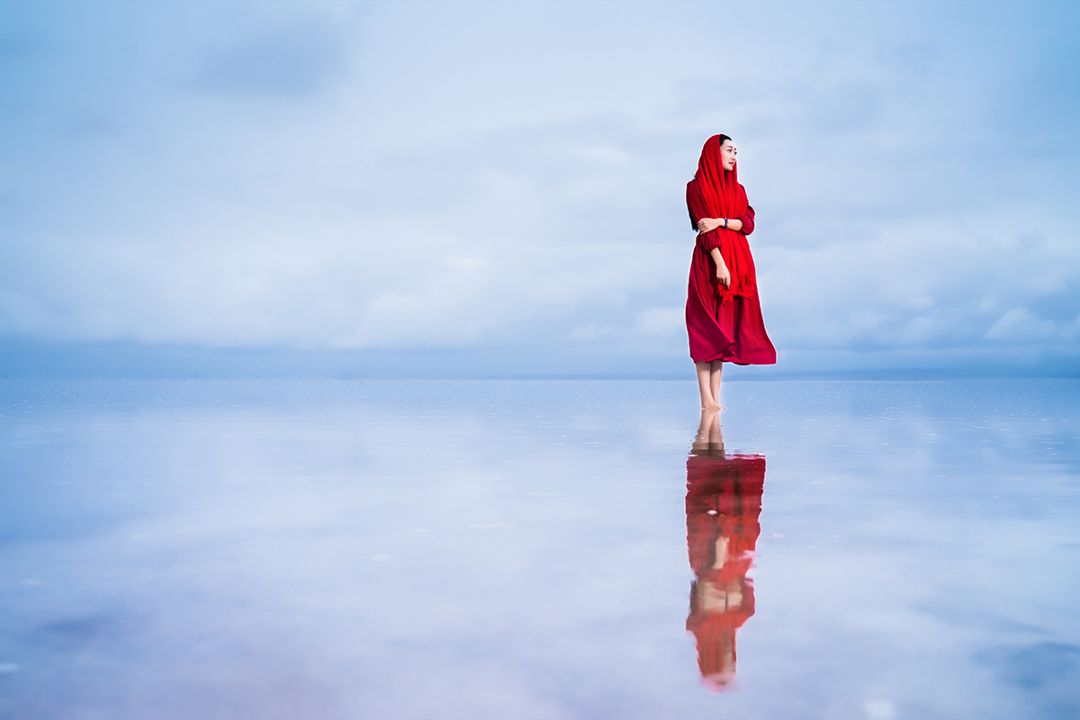 天空和湖面以蓝白冷色调为主,人物着装最好是红橙色,可以形成明显的冷暖对比,点缀单一色彩的画面,起到画龙点睛的作用。如果选其他色系,也是以鲜艳明快为好。