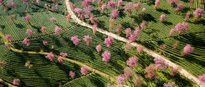 樱花谷本是一座茶园,偶然间茶园主发现樱花盛开的美景,又繁殖了大量樱花,如今墨绿整齐的茶田间杂着粉红的樱花树,大片樱花林在晨雾中盛放,为人们带来了不一样的冬日美景。