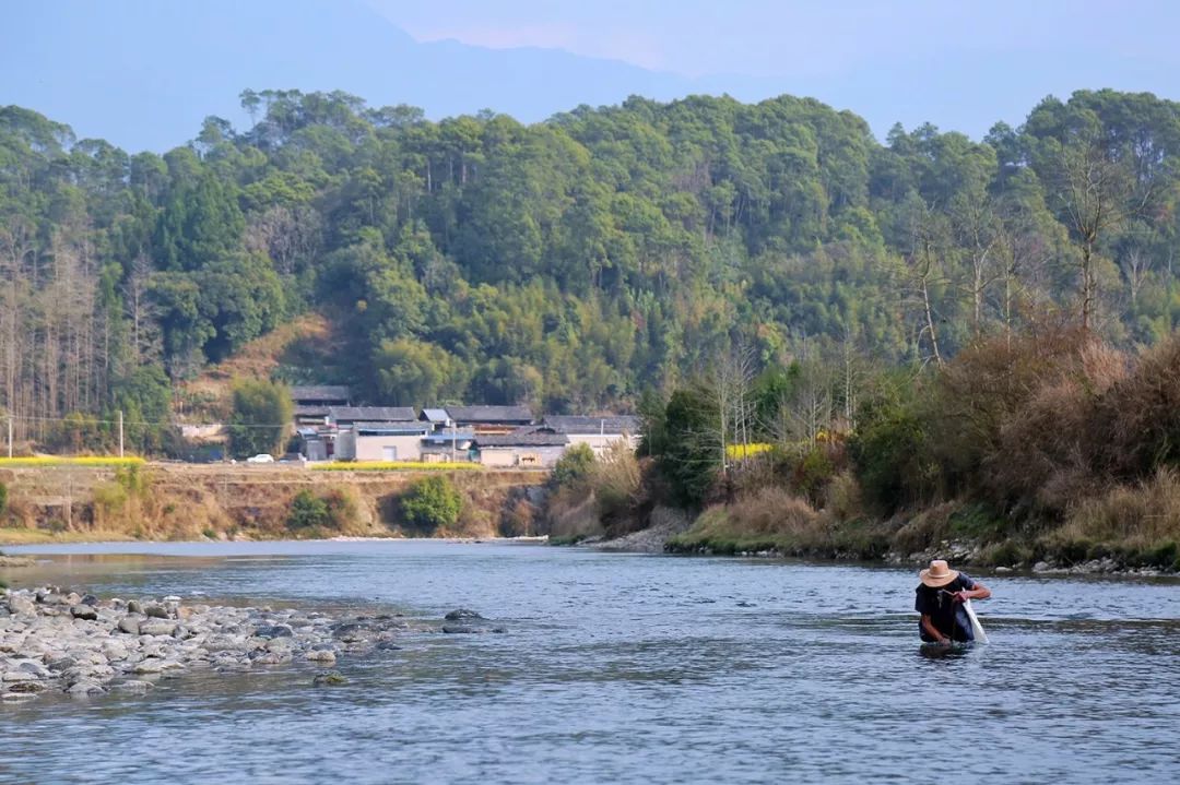 小河中间,站着一个男子。近了一看,才知是当地的老爷爷在捕鱼。
