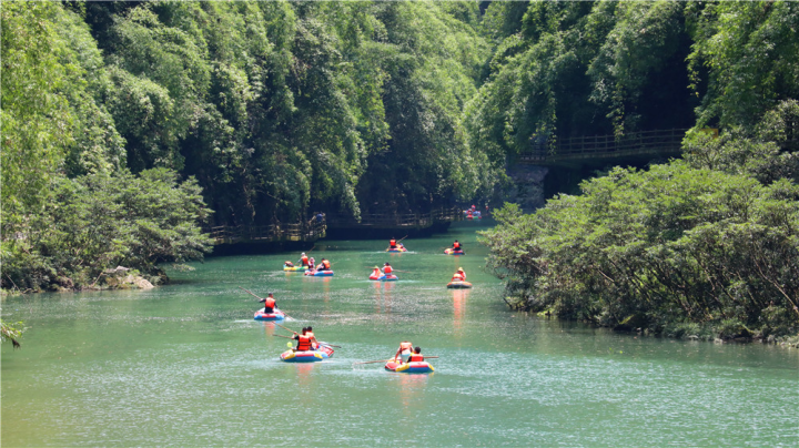没有漂流的夏天是不完整的,武隆仙女峡全长5公里,水清可见底,河床曲折回旋不失漂流之刺激。