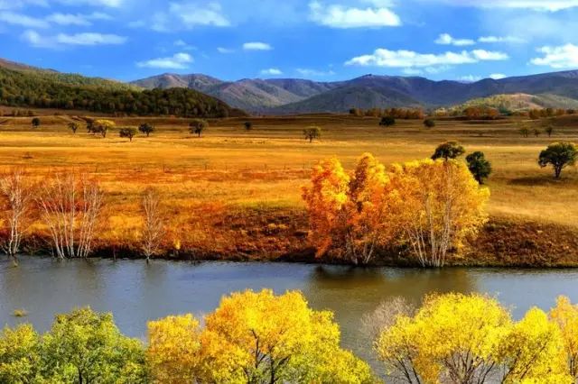 白树干金树冠,成排成排白桦树就草原上的卫兵,傲然挺立于草原上。
