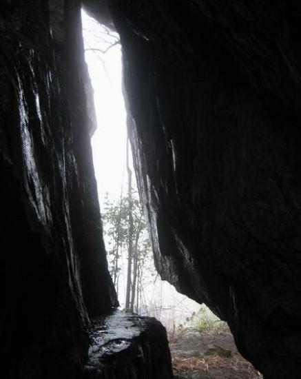由“一步登天”往上攀登,约500米,可见八字石悬崖峭壁险路之间,一桥飞架,状若彩虹,又叫虹桥。登临桥上。俯视山下,宛若置身云端。桥旁有涓涓细流自崖壁间流出,汇成一眼清泉,它与乳泉其实同出一源。