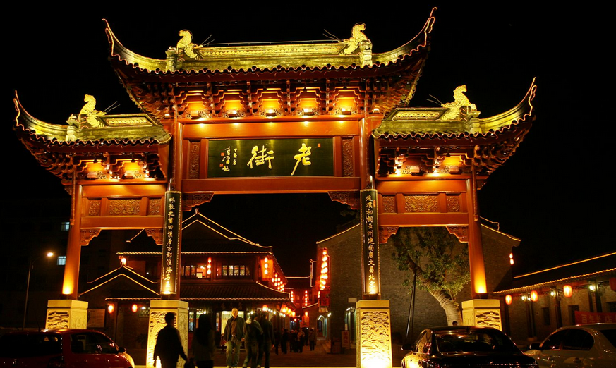 穿过古牌坊进入古老的麻石街巷,迎街两侧为古式店铺,成串的大红灯笼挂满骑楼长廊,诸家店幌、匾额、旌旗相映成趣。可以品尝到完全手工制作的“草炉烧饼”、“泰州干丝”。