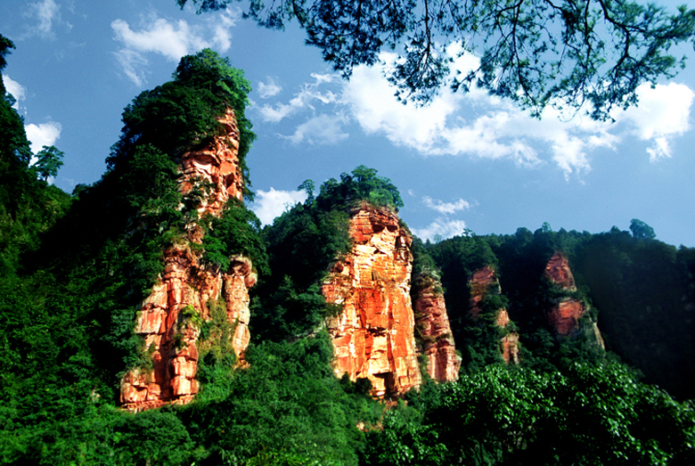 【丹霞景观━━五柱峰】:五柱峰由五根与母岩半分离的高大丹霞石柱并排组成,石柱高度约数十米,远望宛若巨掌,惟妙惟肖。五柱峰的形成是岩石沿节理强烈崩塌的结果。由于岩层平缓,质地坚硬,不同规模的X垂直节理十分发育,加之五柱峰恰好处于一深切沟谷的一侧,由于河流的强烈切割,沟谷两侧的岩石因压力释放而大量崩塌,形成初步发育的丹霞石峰。重力崩塌使得节理之间的岩体凸出成为柱状景观,造型别致,赤红的石柱绚烂夺目如云霞,而青翠的森林又浓得化不开,这两大自然色的组合,呈现出一片生机,似大自然的脉搏在有力的跳动,极富美学价值。