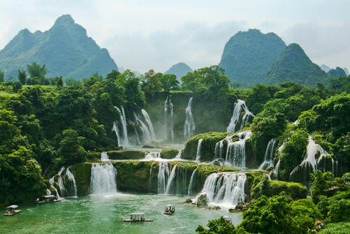 德天跨国大瀑布横跨中国、越南两个国家,是亚洲第一、世界第四大跨国瀑布。瀑布气势磅礴、蔚为壮观,与紧邻的越南板约瀑布相连,神奇而美妙。70米高落差飞泻而下,一波三折,形成三级瀑布,是原生态的自然景观。
