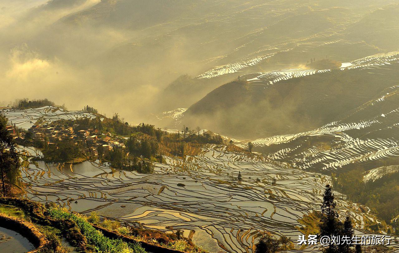 星罗棋布注满水的梯田,一片连着一片,层层叠叠,形状各异,在阳光下或在晨曦里,犹如条条银丝带在山野闪烁,恍如天上人间。放眼望去,晨雾、夕阳、老牛、人家、还有宛如蛛丝一般的田埂,泛着银光的水面,就仿佛是一件精心雕琢的艺术品,伸手便是天堂的模样。