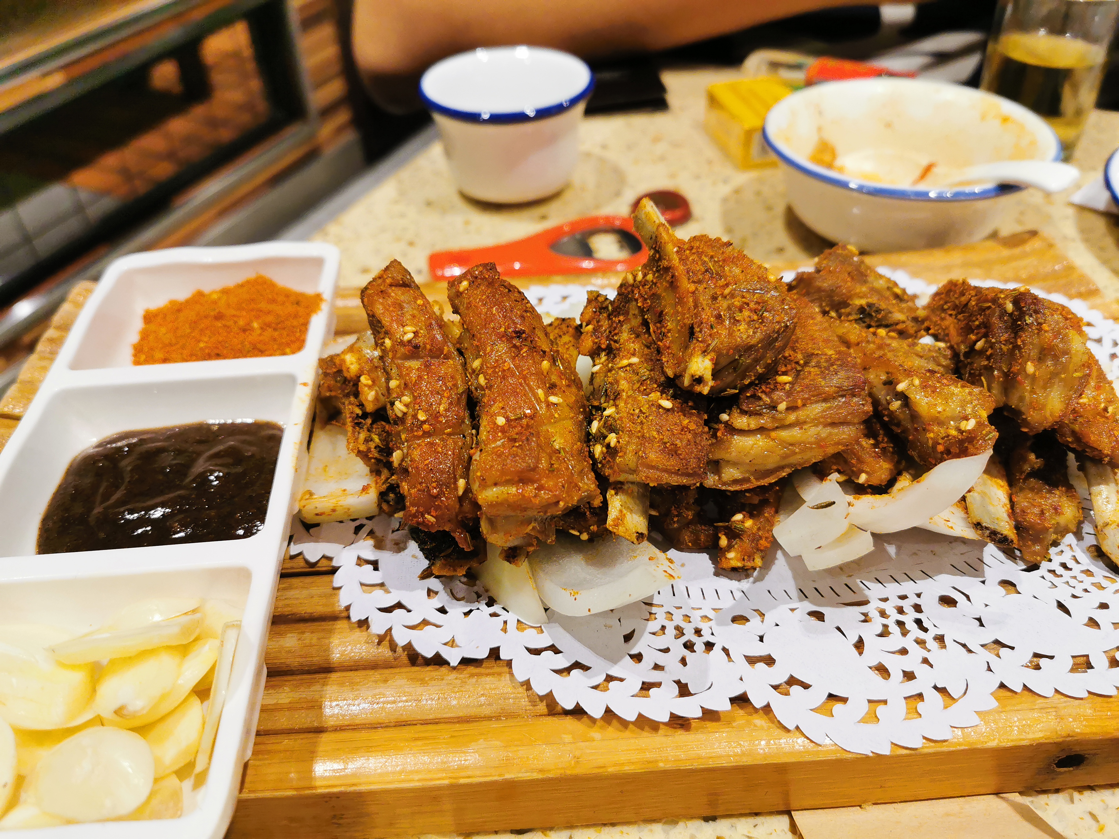 逛了大半天,又开始了出来游玩的重头戏,品尝当地美食,宁夏自古以宁夏滩羊为著名,宁夏滩羊所产二毛裘皮是裘皮中的上品、宁夏的“五宝”之一,盐池“三宝”之首。宁夏滩羊肉细嫩,无膻腥,脂肪均匀含量低。来银川一次,怎能不大啖一次羊肉呢。我们去的是大众点评上推荐的红柳枝滩羊烧烤,去之前其实主要是抱着打卡的目的,因为我们都不是很爱吃羊肉,没料到去到以后对羊肉的看法大大改观,我们点了八宝茶,一个大拌菜,烤羊羔肉串和烤羊肉串还有烤羊排。重点表扬烤羊羔肉串,羊肉软熟软熟的,调味也很好,外面烤出一层薄薄的焦糖色,咬上去第一口有烧烤特有的酥焦口感,马上就是羊羔肉的软烂,几乎不太用咀嚼就滑下喉咙。涛哥觉得最好吃的是烤羊小排,羊肉酥烂有嚼劲。我推断女生可能会比较青睐羊羔肉,男生可能会更爱羊排的大口吃肉的快感。八宝茶里有芝麻、核桃仁、玫瑰花酱等等,香的很,就是不像喝茶,像吃甜品哈哈哈。大口吃肉之余来一口浓香的茶,过瘾。