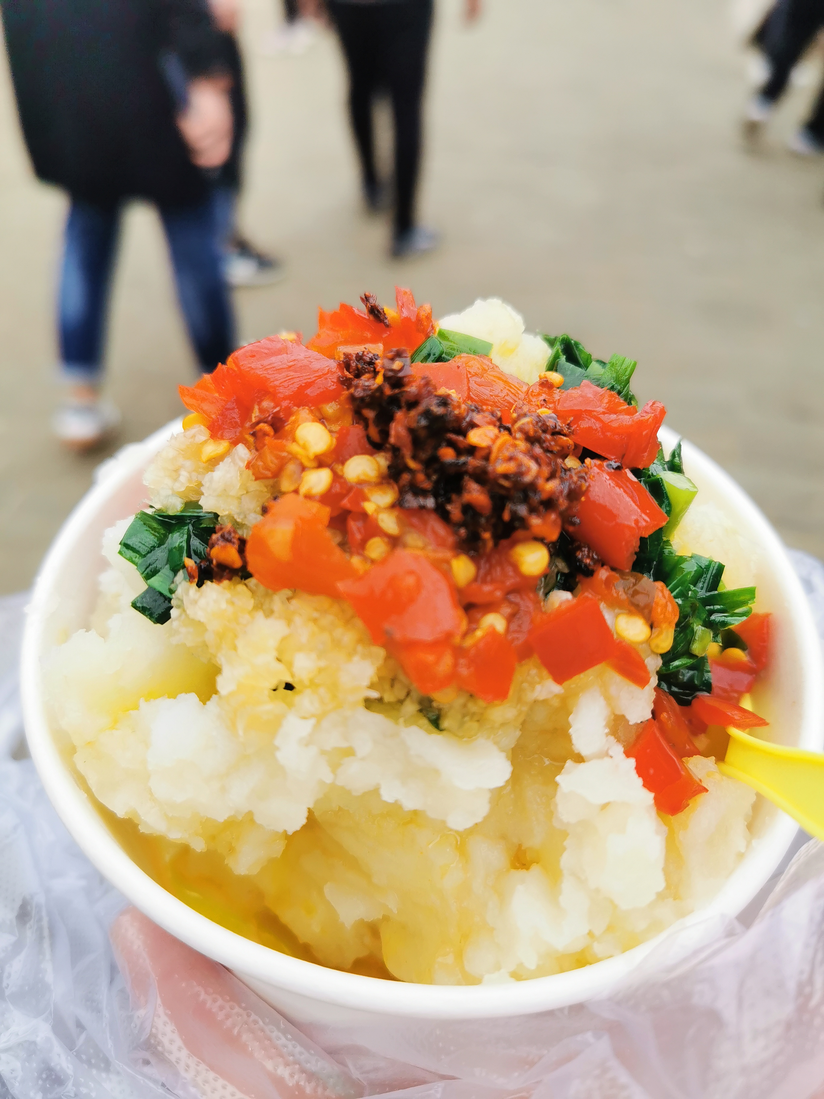 在老银川古街上买的洋芋擦擦,放了剁椒和腌韭菜。