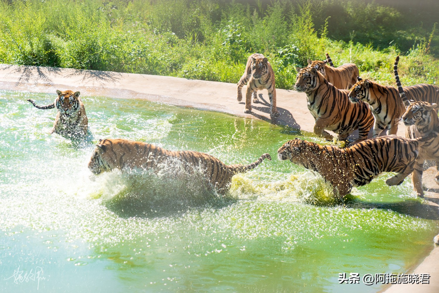 此时来了一辆绿色吉普车,林子里大部分老虎都跟在它身后,日常肯定都是由这辆车给它们带来了美食。我隔着铁丝网,看着老虎们在池子里进行了一场生死争夺,速度非常快,一只强者老虎已经抓到了鸭子。