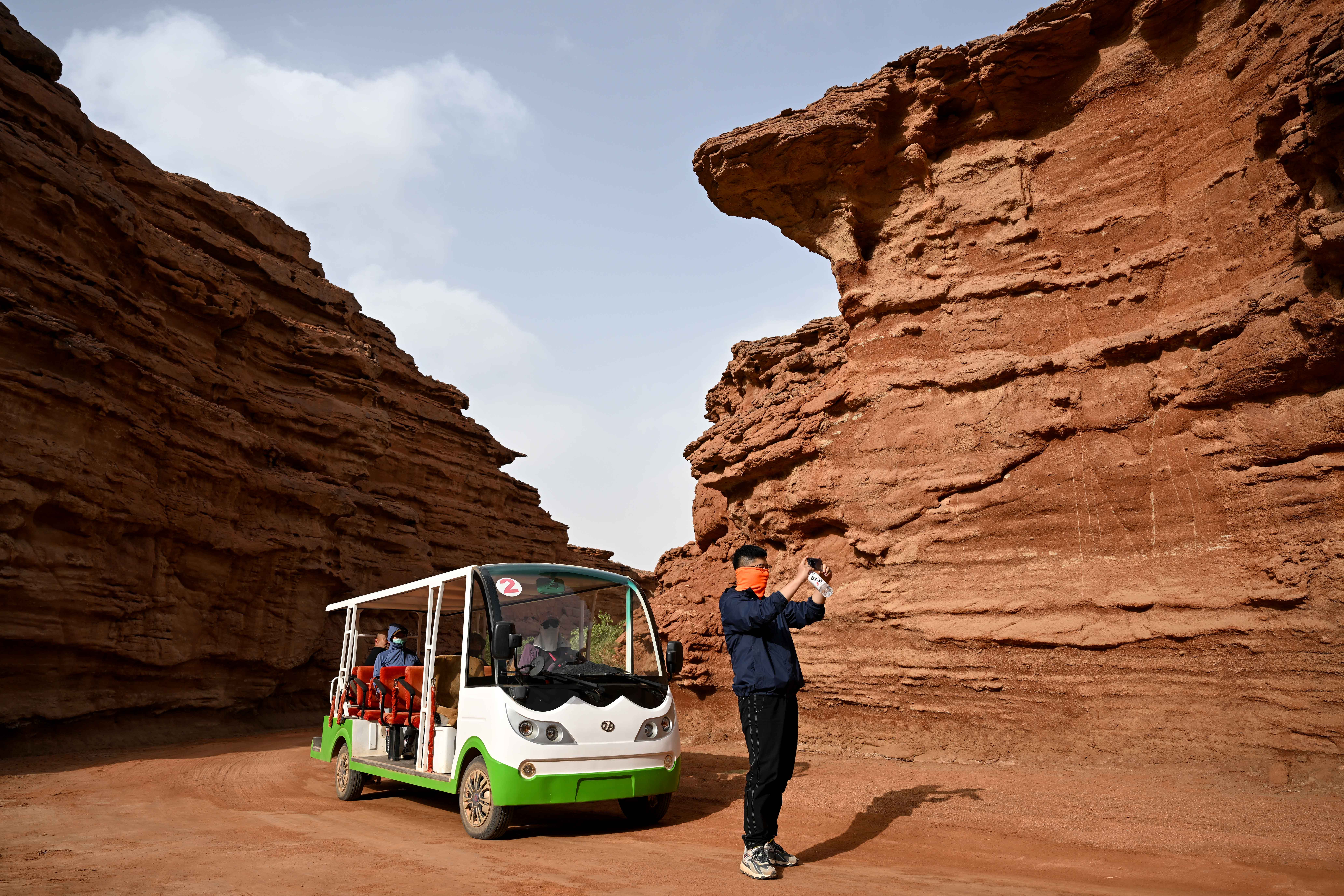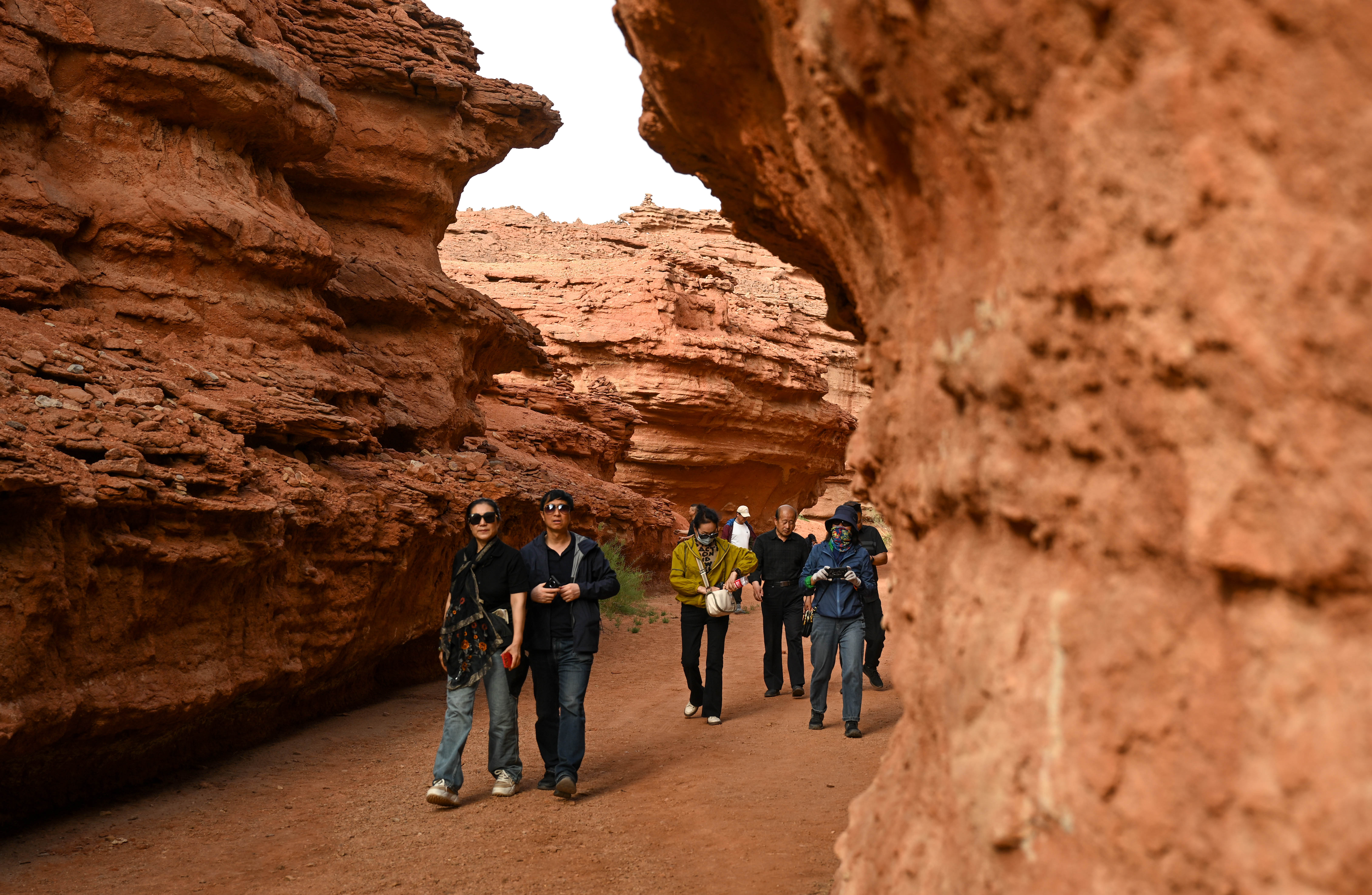 5月13日,游客在内蒙古阿拉善盟阿拉善左旗西部梦幻峡谷景区参观游玩。 新华社记者 贝赫 摄