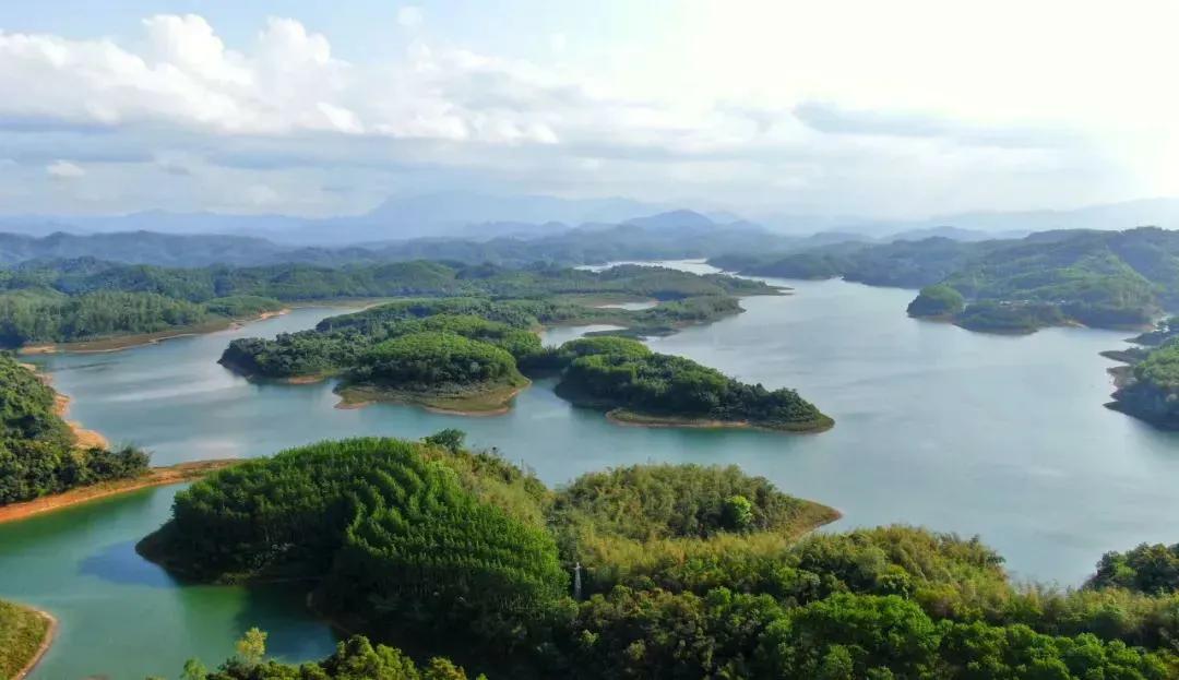 红坎瀑布的下游就是号称占地"千亩"的红坎天然湖,这里是养生垂钓、运动探险、休闲度假的好去处。