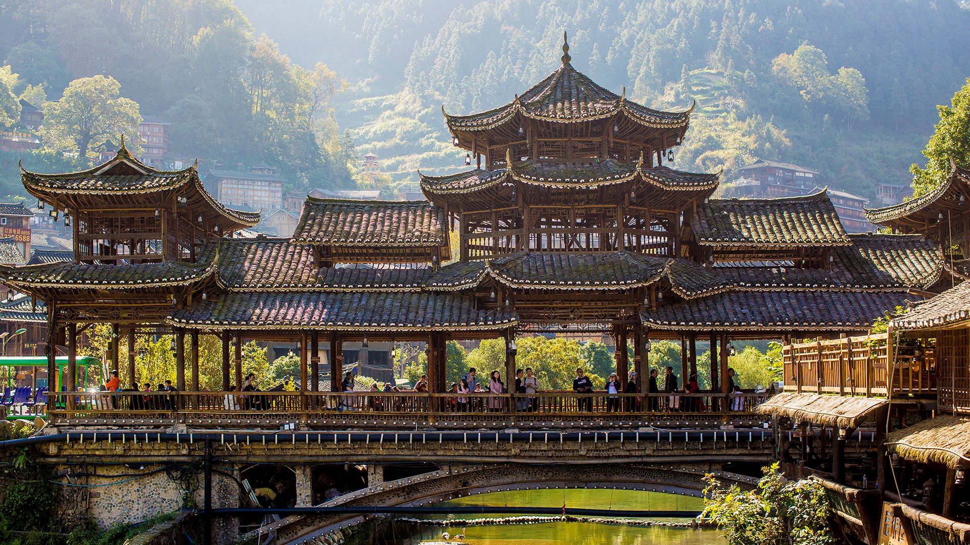 肇兴侗寨是全国最大的侗族村寨之一,拥有6000多名居民,被誉为"侗乡第一寨"。该寨的房屋全部采用干栏式吊脚楼建造,依河而建,错落有致。寨内居民皆姓陆,寨区以鼓楼自然片区为界,当地称之为"团",各旅店的地址也主要以团的名字为参考。鼓楼作为侗寨的标志,是人们集会、社交和休闲的场所。五座鼓楼的外观、高度和大小各具风格,形成壮观的景观。