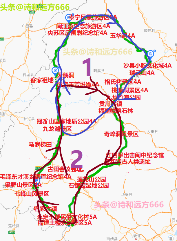 蓝色的数字表示在闽西当地建议停留的天数,建议用时不少于7天。建议一天一景点的行程