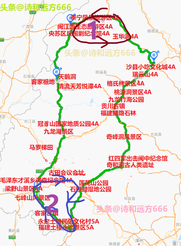 因为时间问题只有继续缩减路程,节约自驾时间,这两条闽西自驾路线的特点跟上面两条6天自驾线差不多。