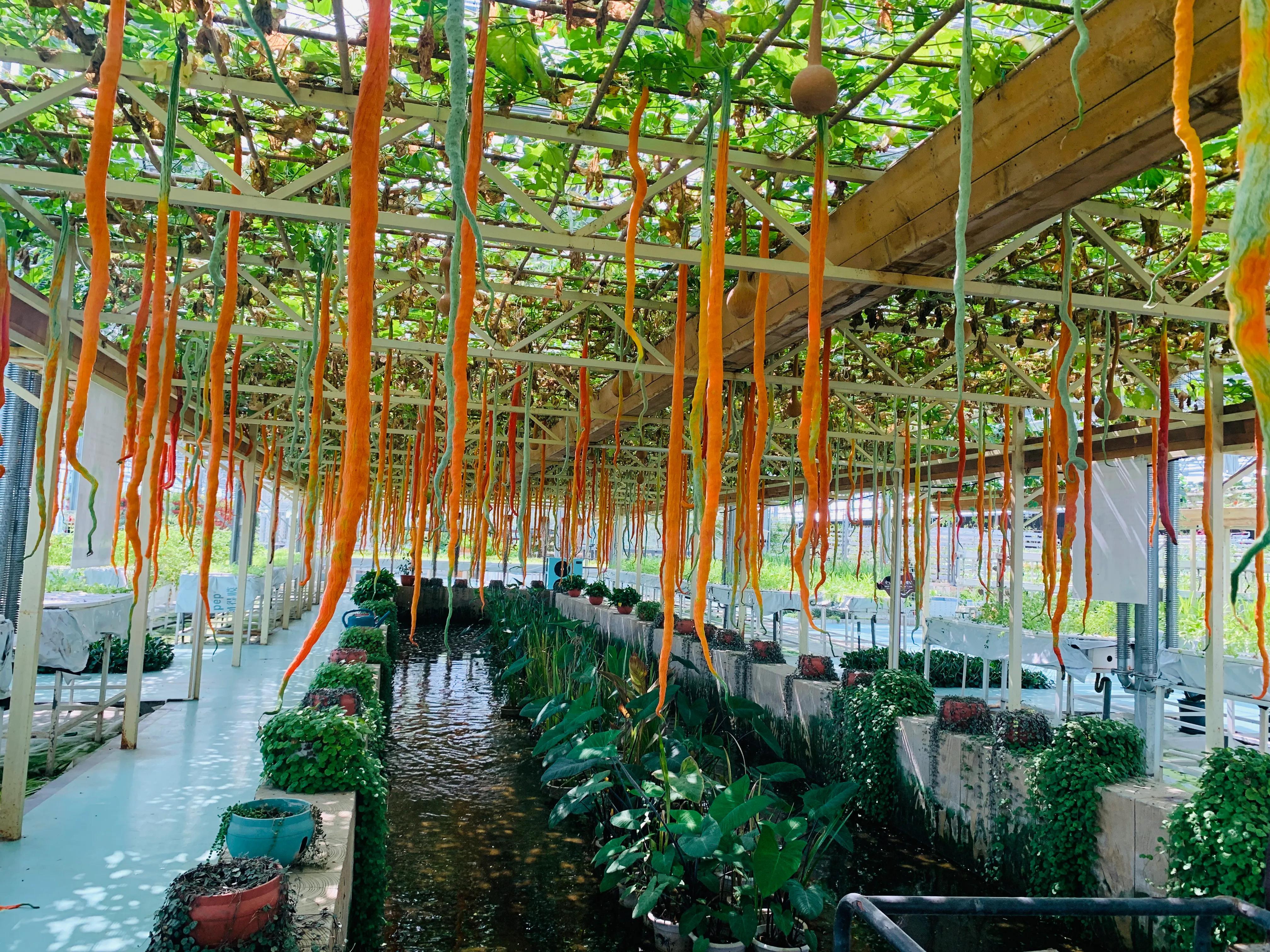 旅游能使人心胸开阔,让人变得更简单,匪艺嘉蔬馆种植的蛇瓜一不留神就把棚架爬满了,青的青、黄的黄,飒是好看。