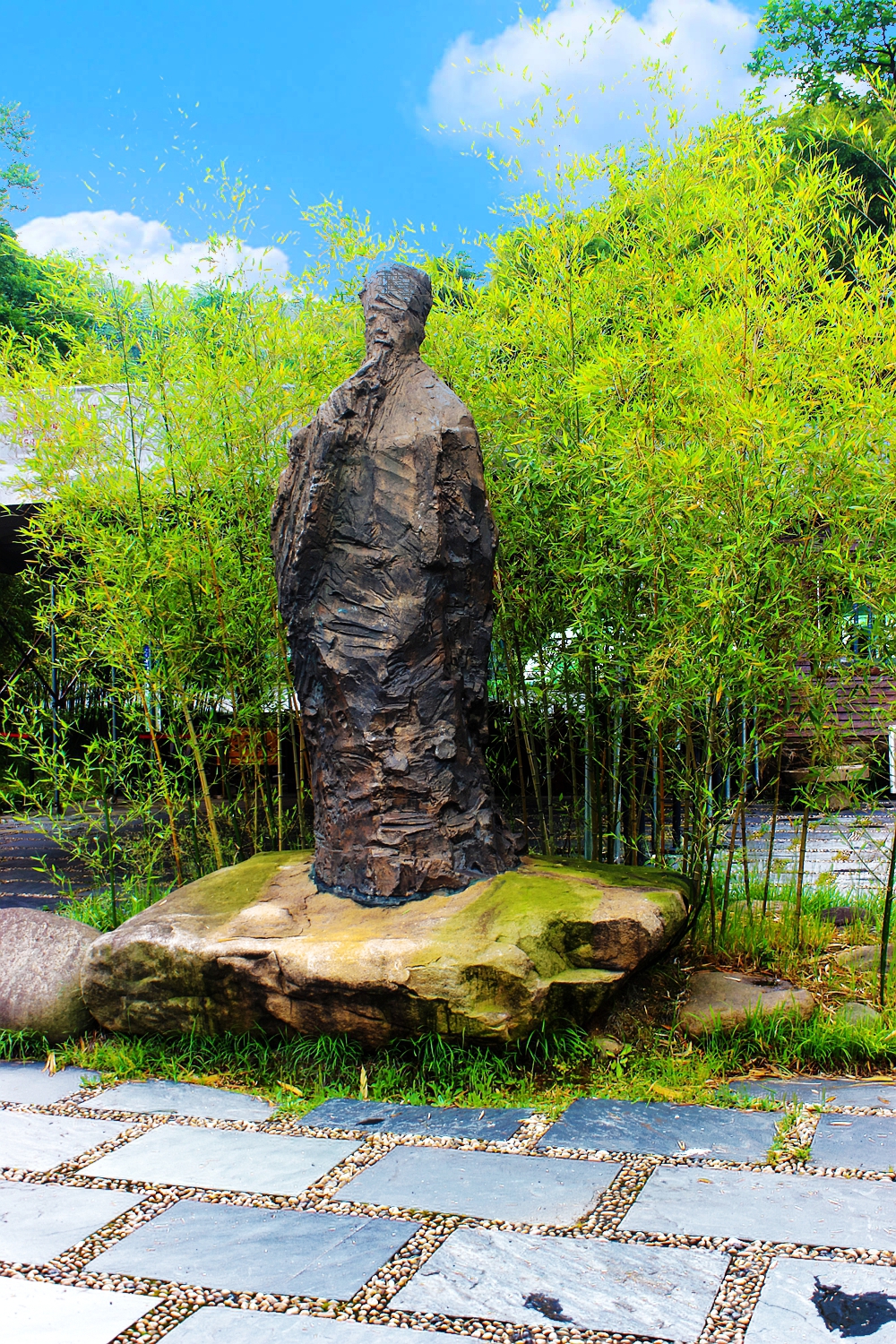 沿着幽深的小径直走,来到一处种满竹子的小院。这里雕刻着一尊“东坡咏竹”像,这尊雕像描绘了大文豪苏东坡游览竹海时挥洒豪情,写下著名诗句的景象。