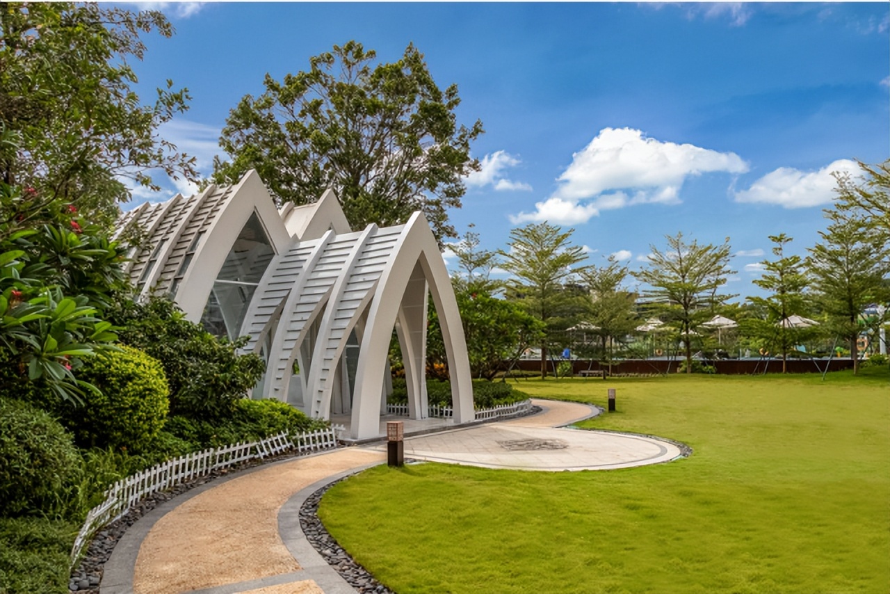 酒店依山傍水,亲近自然,对于山水与树木的运用十分到位,采用了以"鱼米之乡"为主题的中式园林设计,古色古香,韵味十足,步入酒店的那一刻,你已踏上1000+㎡的户外草坪,行走在铺满大理石的徒步小径之上,绿植和鲜花点缀其中,欣赏曲觞流水之景。