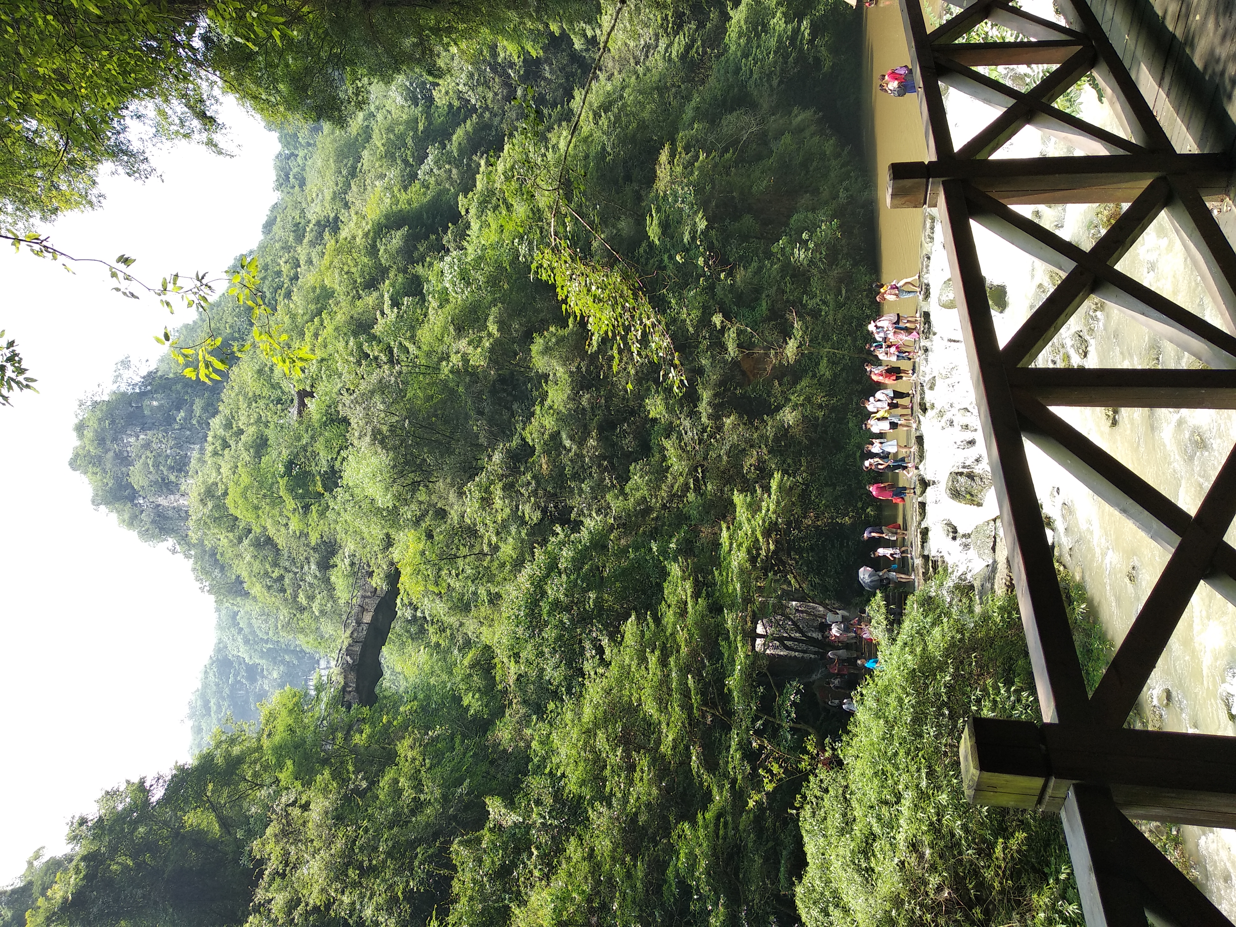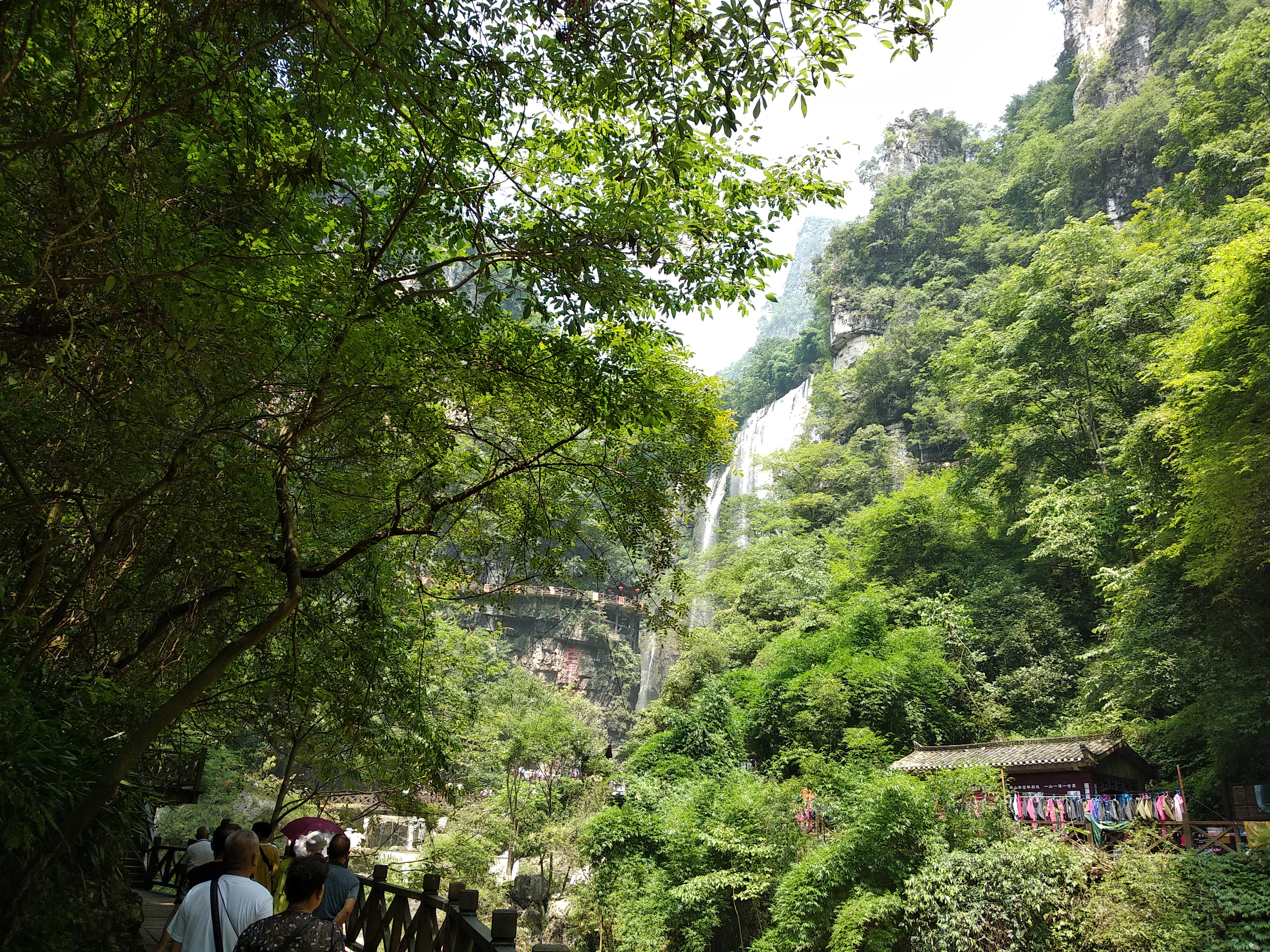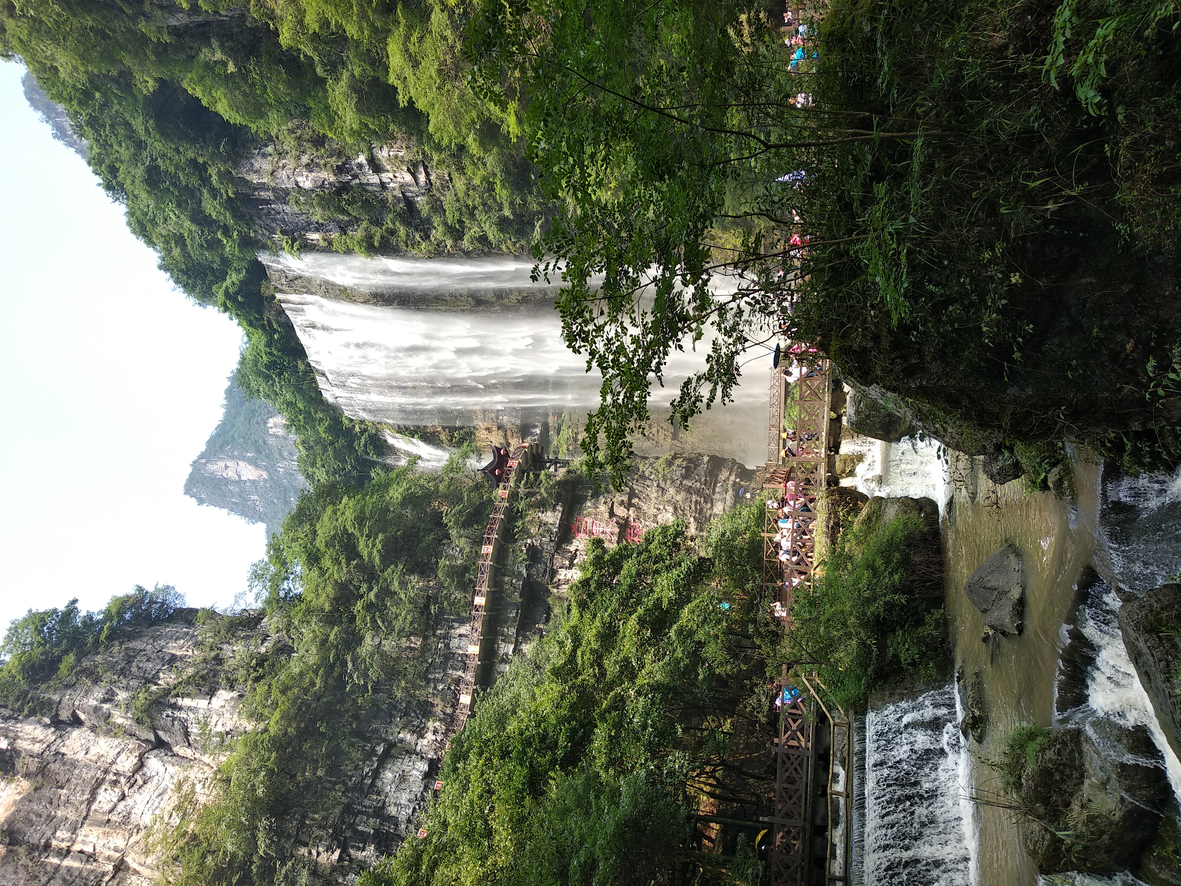 亦步亦趋,终于到得了瀑布的正面——一处廊桥转折处的平台,细细端详着藏在这幽深峡谷大瀑布的面容——只见她接天连地,水天雾海,像一条巨大的数十米宽的银链从数百米高的悬崖上跌落而下至峡谷的深潭。远处连天栈道环绕期间,两峰之间的拱桥巍峨高远。