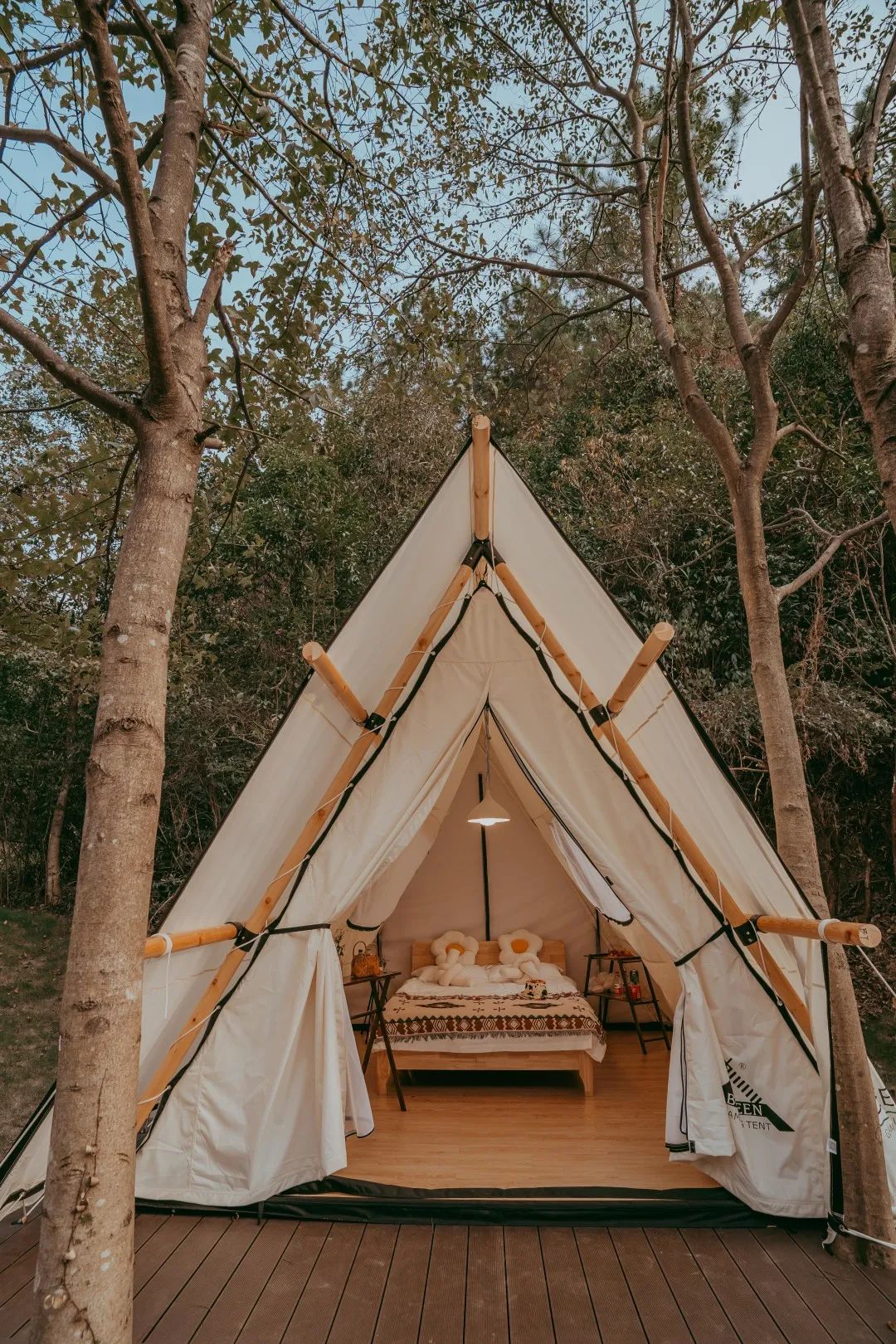 帐篷酒店分为3米宽印第安塔帐和6米宽蒙古马戏团帐,850亩的山林里总共只有16顶,私密性高,其实更像野奢酒店。