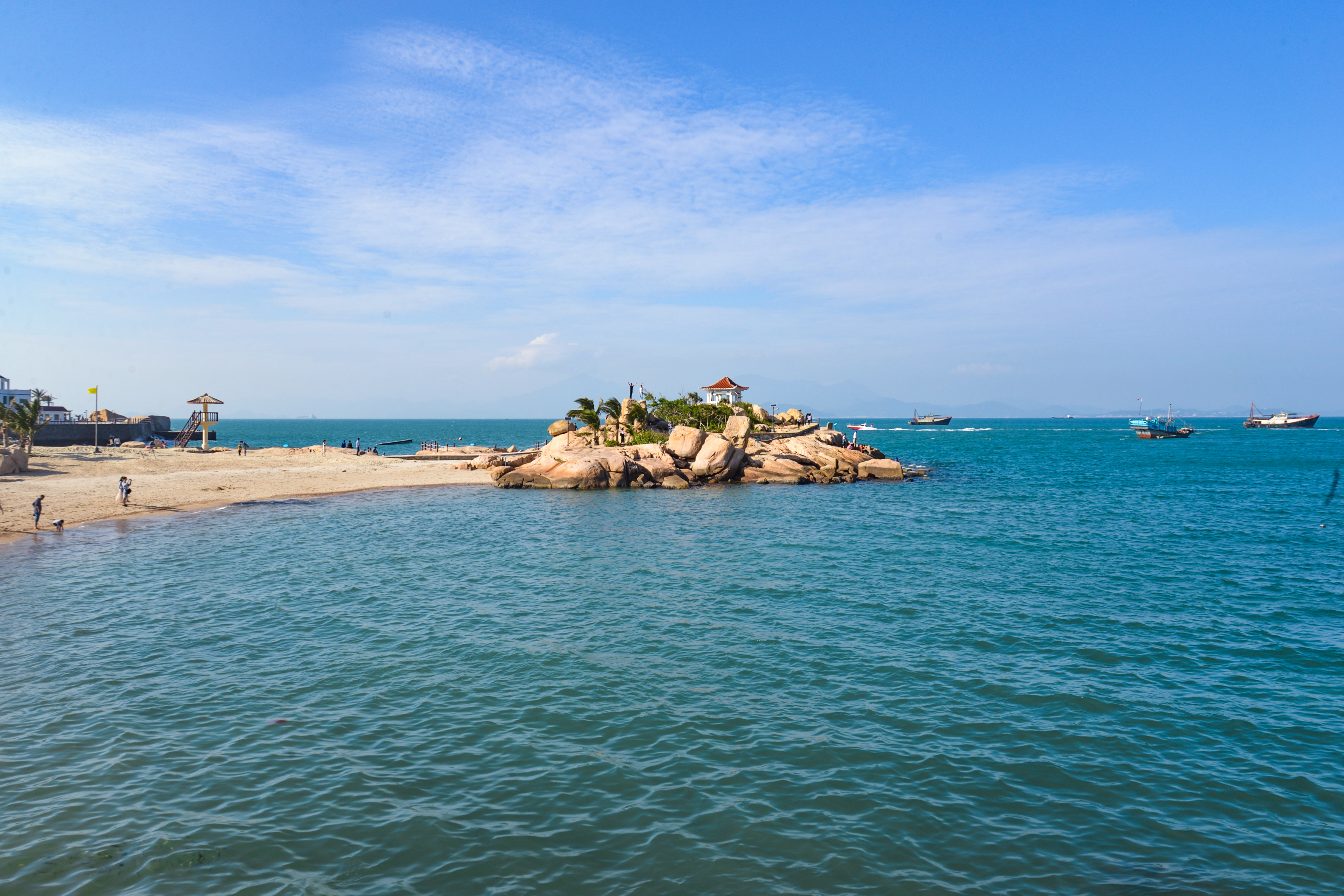 当天去岛上,碰巧遇到了华南健美大赛在岛上举行,算是意外的惊喜。景色最美的当属临海栈道,船只较多,景色非常美,心旷神怡。住宿地方距离沙滩十分近,另外距离沙滩不远处有双子亭,天气晴好时,香港的高楼大厦、车水马龙,清晰可辨;有雾的时节,香江景物,时隐时现,仿佛蓬莱仙境中的海市蜃楼。