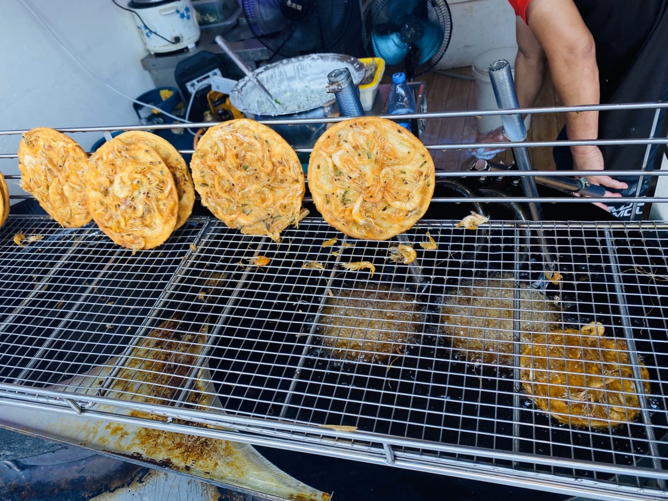 第三天早上起来的晚,在民宿附近花了60元租了一个电动车,我们去了老街,去门没有多久就下雨了。还好没有下多久,民宿到老街,骑电瓶车要20多分钟,老街妥妥的南洋风里面很多卖虾饼的我们就随便找了一家真的太好吃了吧虾饼 五元一个,炸虾6元虾特别大,墨鱼丸也是五元。老街都可以骑电动车进去,