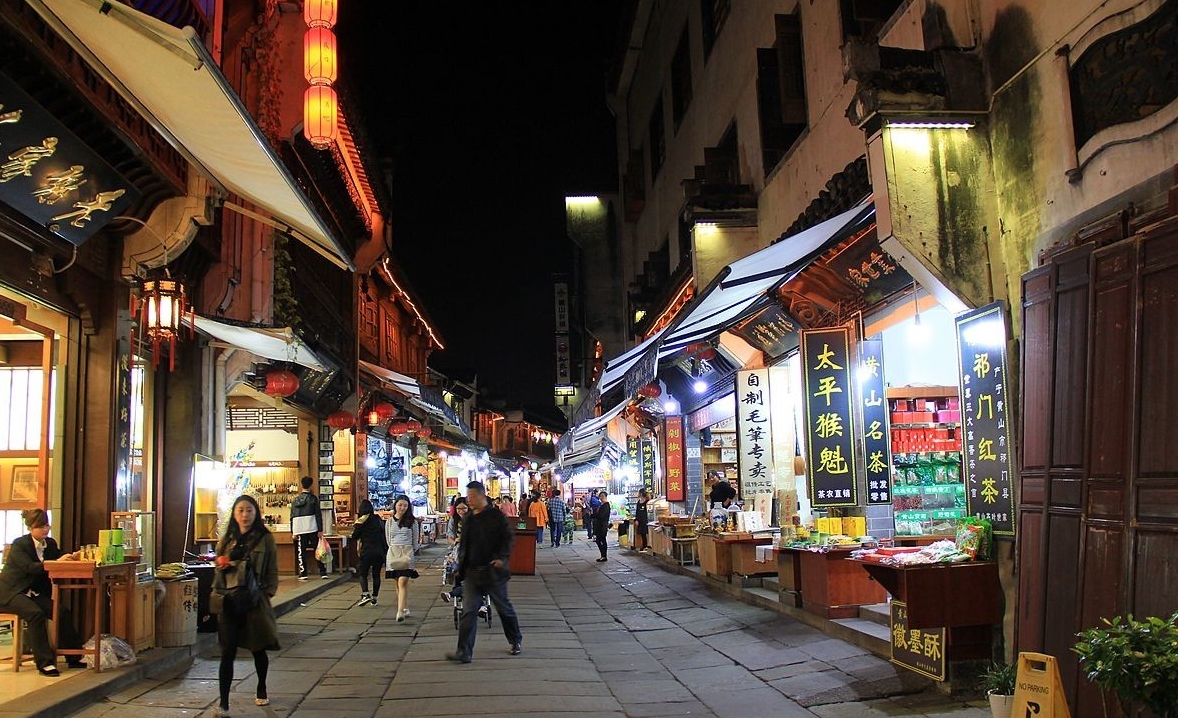 屯溪老街: 屯溪老街座落在安徽省黄山市屯溪区中心地段,北面依山,南面傍水,全长1272米,精华部分853米,宽5至8米。包括1条直街、3条横街和18条小巷,由不同年代建成的300余幢徽派建筑构成的整个街巷,呈鱼骨架形分布,西部狭窄、东部较宽。
