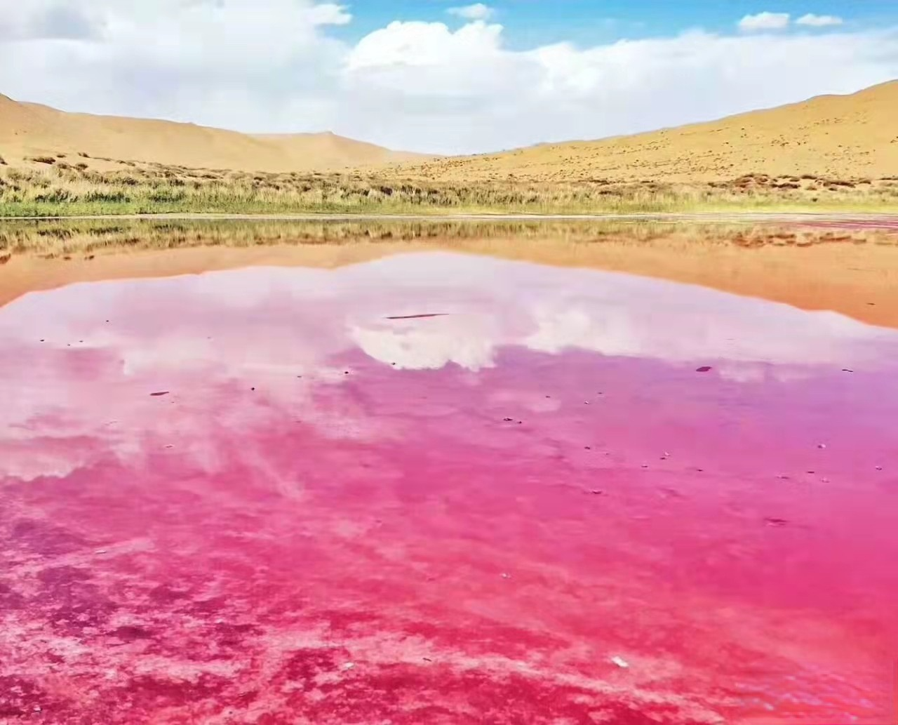 水源来自祁连山冰川积雪,通过地下断层流入沙漠,水源溢出地面,便形成了沙漠湖泊。