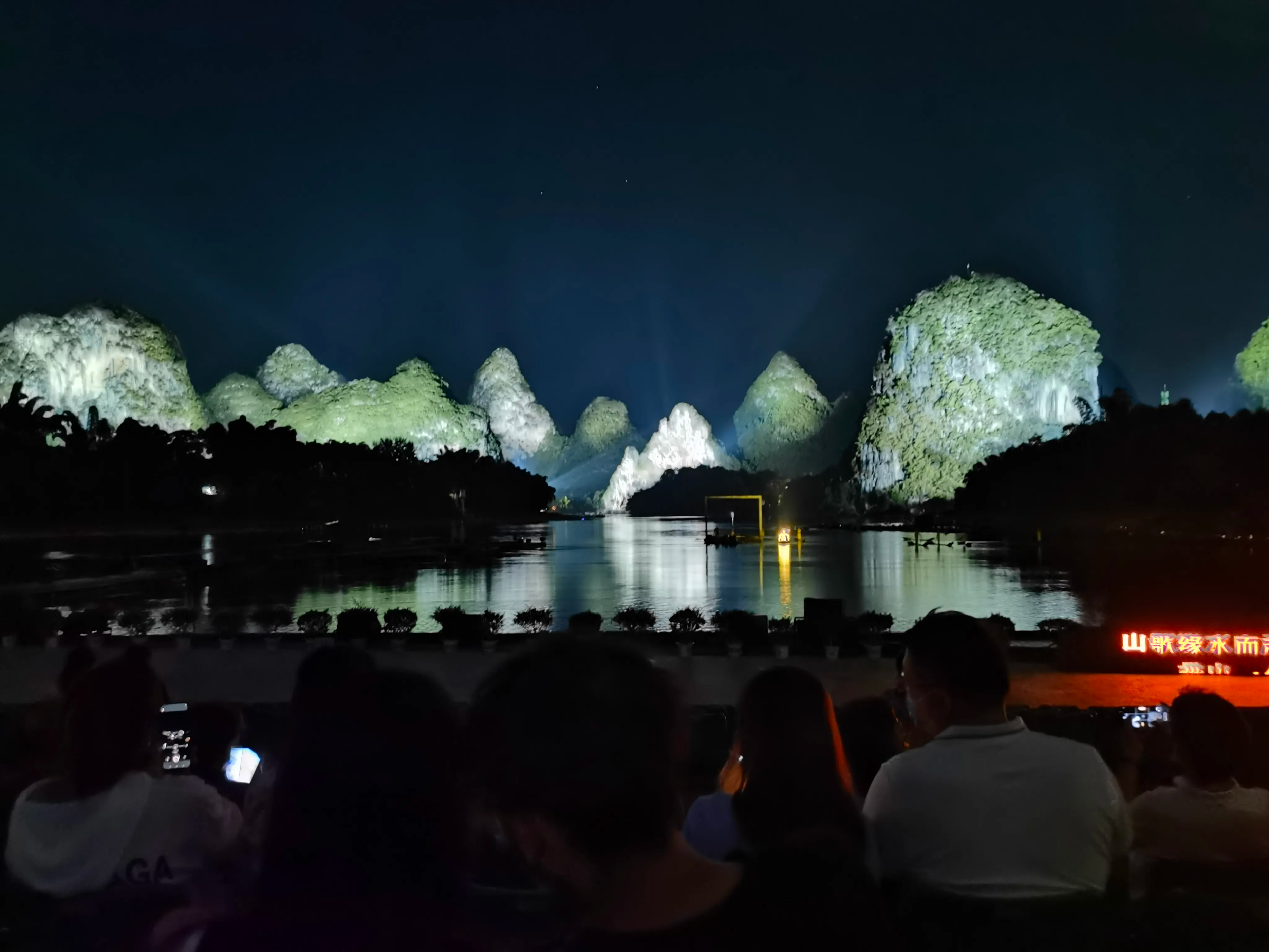 6、看印象刘三姐演出:吃过晚饭后,我们就骑着电动车到印象刘三姐剧院。印象刘三姐是漓江山水剧场之核心工程,由张艺谋导演的全国第一部“山水实景演出”,开演时间是20:00。我们的票是直接跟出租电动车的阿姨购买的,我们买的B2区的位置,135元一人,比美团上购买便宜了不少,位置是随机的,由于是淡季的原因,进场后发现有三分之二的座位没未售出,等演出开始后,可以到无人的座位上观看,由于场景比较大,人物多,建议尽量往前坐,这样才能看得清。