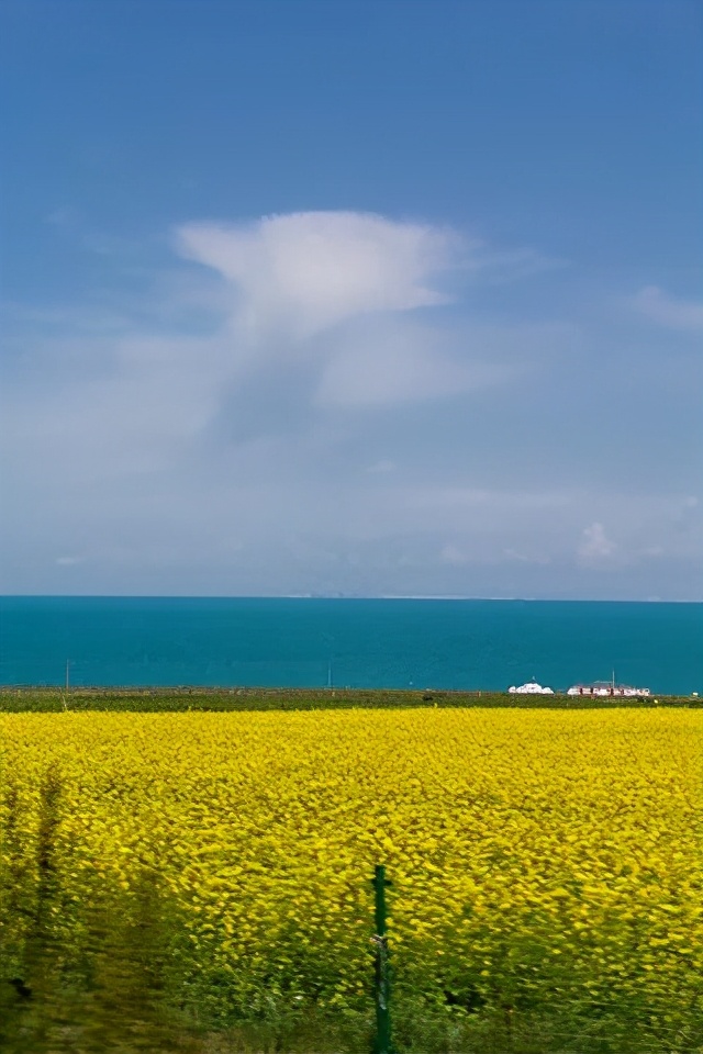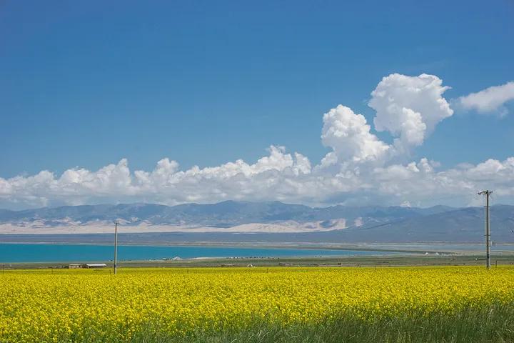 其中以7-8月尤为优美,湖边有大片的油菜花开放,黄色的花田和一望无际的蓝色湖水相互配衬,非常漂亮。