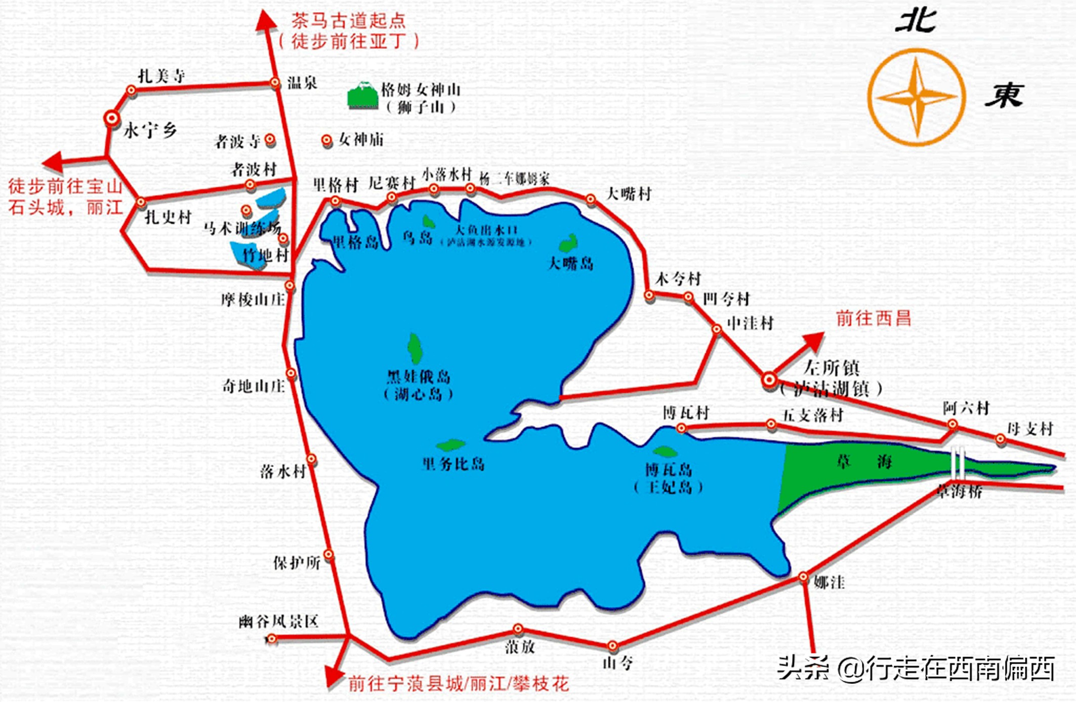 第二天起来,我们沿顺时针方向驾车环湖游玩,依次经大里格半岛、尼塞村、小落水村。情人滩,草海等景点,几乎每个地方都有码头,游客可以乘船到湖中几个较大的岛屿。