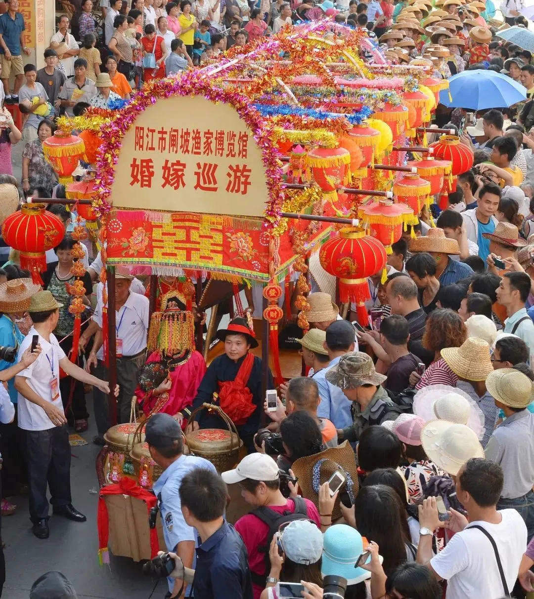 闸坡疍家渔民婚俗,是流传于粤西沿海地区的水上居民生活的一个独特水上文化现象。过礼、哭嫁、陆上迎亲、背新娘、巡游、媒婆闹场、升字拜堂、渔家婚宴等仪式,满满的疍家渔民水上生活风味。