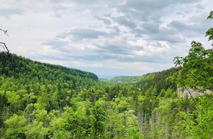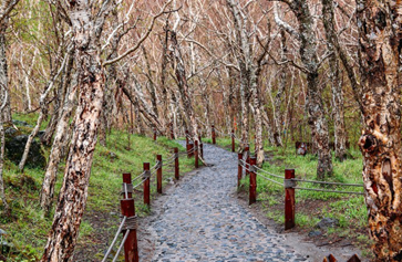 峡谷两岸生长着茂密的大森林,树木笔直粗壮,由于谷上低温潮湿,使得这老林子里挂满了苍老的白丝,苔藓、蘑菇等,增添了许多神秘色彩。
